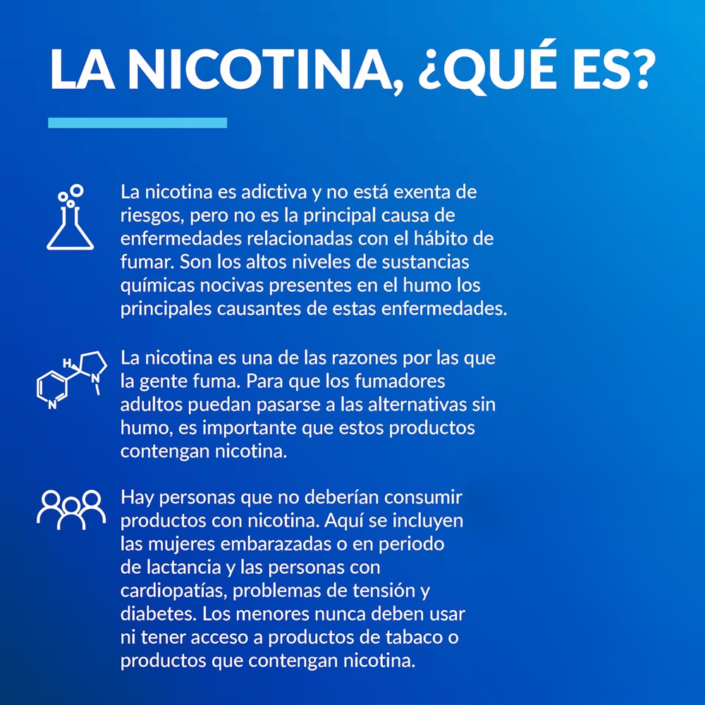 Hay personas que no deberían consumir productos con nicotina. Aquí se incluyen las mujeres embarazadas o en periodo de lactancia y las personas con cardiopatías, problemas de tensión y diabetes. Los menores nunca deben usar ni tener acceso a productos de tabaco o productos que contengan nicotina.
