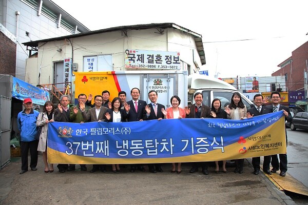 한국 필립모리스㈜(대표이사 정일우)가 사회복지공동모금회(회장 이동건)와 함께 2일 경기도 화성시에 위치한 사랑노인복지센터(센터장 박영순)에 37번째 ‘먹거리 나누기 냉동탑차’를 기증했다.