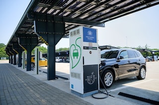 Image: EV charging station under the solar-powered parking roof at the factory